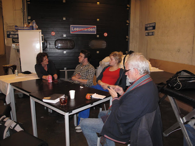 Het ijs is besteld en gemaakt. Voor alle 32 voorstellingen zijn per keer 8 blokken nodig. Een blok kan voor twee voorstellingen gebruikt worden. Ergens, in een enorme vriezer, liggen dus meer dan 100 blokken. Maar dan blijkt dat het ijs ondoorzichtig is. Dat is niet wat het moet zijn. Dat is niet wat besteld is. Het water is tijdens het invriezen niet in beweging gehouden. Dan krijg je geen mooie transparante ijsblokken met mooie aders als de felle lamp erboven aan is en het water in grilligheid wegsmelt. Maar, zo is beloofd, donderdag bij de premiere, is er nieuw, goed, ijs. |